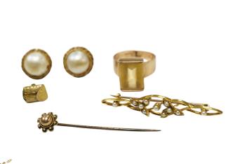 Lot 1917 , A collection of jewellery, including an Edwardian gold and seed pearl brooch, gross weight approximately 2.5 grams; a citrine ring in 9ct gold, British hallmark, split shank, gross weight approximately 4.5 grams; a gold
