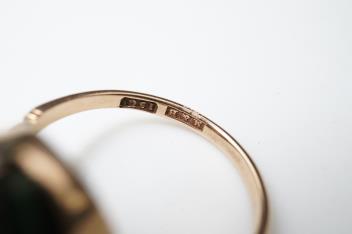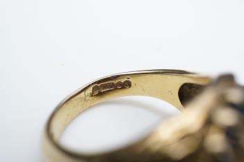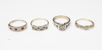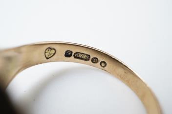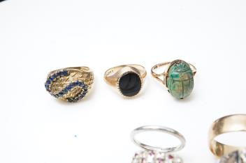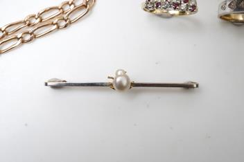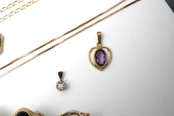 A collection of jewels, comprising: a dress ring of textured design set with sapphires in an 'S'-shaped arrangement; an onyx signet ring; a garnet and diamond half-hoop ring; a ruby and diamond half hoop ring; a diamond ring and matching pendant; a diamond half hoop ring; a figaro chain bracelet; and an opal, emerald and cubic zirconia cluster pendant necklace, one emerald deficient, all with British hallmarks for 9ct gold, combined gross weight approximately 29 grams; a faience scarab ring mounted in gold, size R, stamped 15CT, gross weight approximately 4 grams; a platinum wedding band, size L, inscribed 'ALL MY LOVE', dated 29.5.48, gross weight 3 grams; a heart-shaped locket and a Maltese cross pendant, each on chains, each stamped 375, combined gross weight approximately 11 grams; a wide wedding ring, size U, gross weight approximately 4 grams; and a bar brooch centring on a beetle motif set with an untested pearl, mounted in gold and platinum, gross weight approximately 2.5 grams; and a purple paste and rolled gold pendant