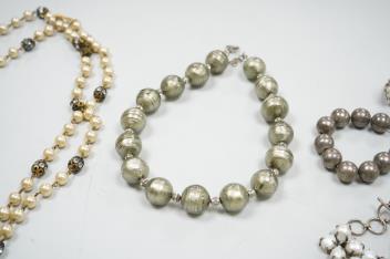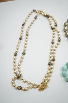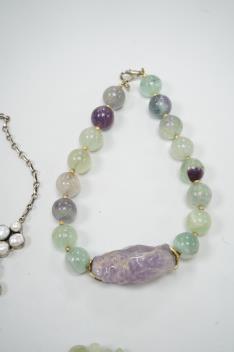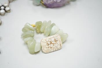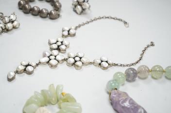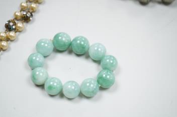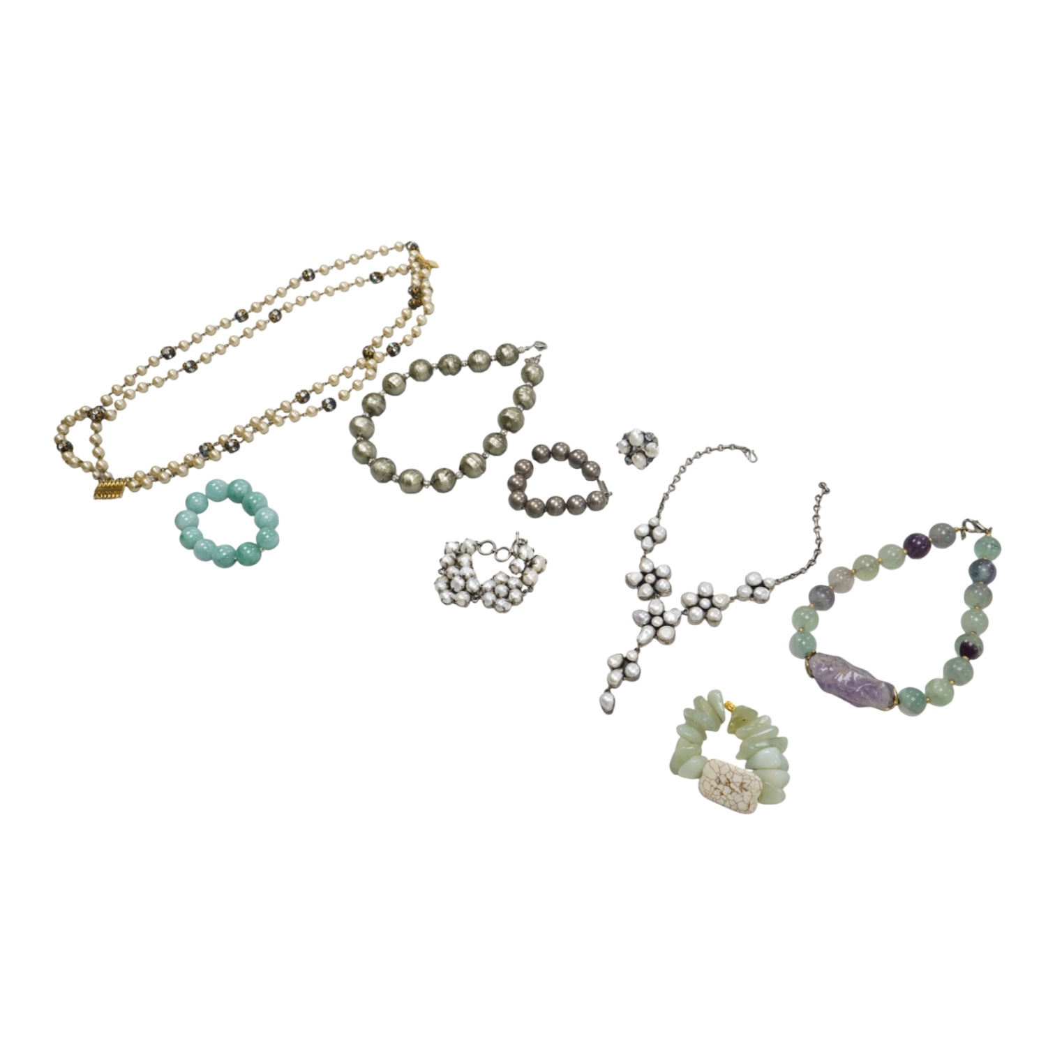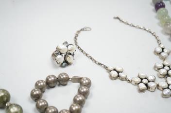A collection of jewels, comprising: a suite of cultured pearl jewels including a ring, a necklace and a bracelet, each mounted in silver; a jadeite bead bracelet; a serpentine and white hardstone bracelet; a fluorite bead necklace; a simulant pearl and paste necklace; and a silver bead bracelet; and a glass bead and paste necklace