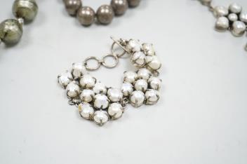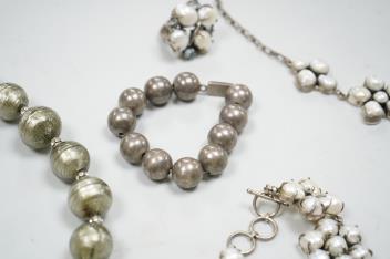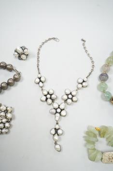 Lot 908 , A collection of jewels, comprising: a suite of cultured pearl jewels including a ring, a necklace and a bracelet, each mounted in silver; a jadeite bead bracelet; a serpentine and white hardstone bracelet; a fluorite bea