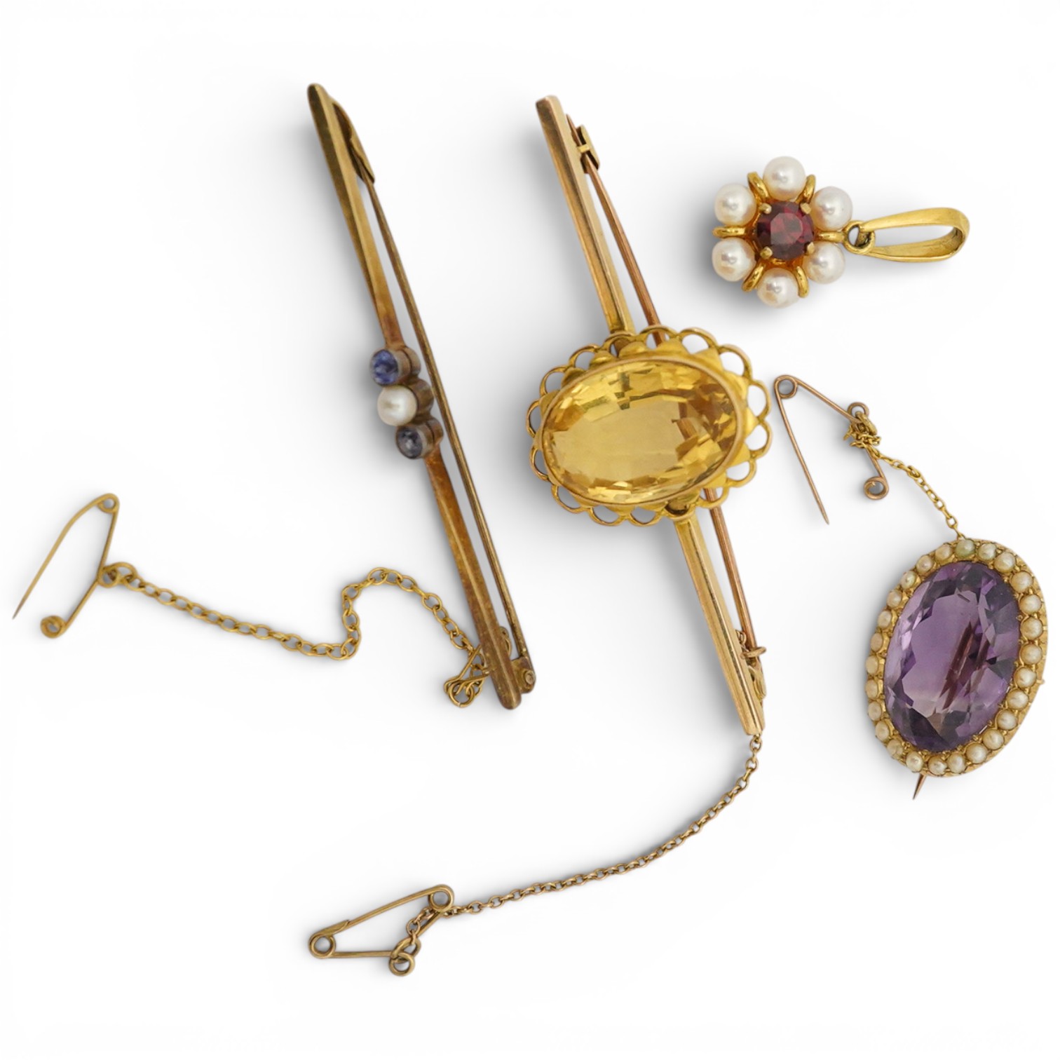 A collection of jewels, early 20th century and later, comprising: a bar brooch set with an oval citrine, length 6.4cm, and an oval amethyst and seed pearl brooch, each stamped 15ct, combined gross weight approximately 15.7 grams; a garnet and cultured pearl pendant in 9ct gold, British hallmarks, gross weight approximately 2.8 grams; and a pearl and sapphire bar brooch, stamped 18ct, gross weight approximately 3.9 grams, pearl untested