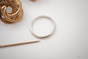 A collection of jewels, including a pair of earrings of knotted design in 9ct gold, 2.2cm diameter, British hallmarks, combined gross weight 6 grams; together with an untested pearl and enamel stick pin of knotted design; a gilt metal eye glass on a ribbon; a platinum wedding band, size M1/2, stamped PLATINUM, gross weight approximately 2 grams