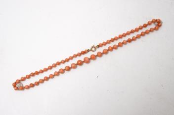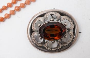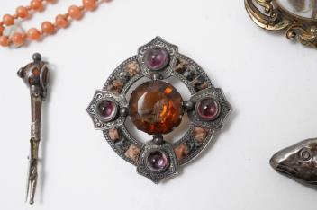 A collection of jewels including a coral necklace, comprising: a coral bead necklace, beads 4.5-8mm, length 38cm; two tortoiseshell piqué work brooches, two Scottish hardstone brooches; a Scottish brooch set with an oval citrine; a silver brooch modelled as a fish; a shell cameo brooch depicting a Muse; an amber cabochon brooch, length 3.8cm; and a hairwork brooch in rolled gold, length 5cm