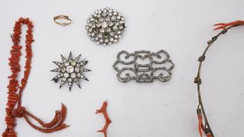 A collection of jewels including a coral tiara, 19th century, comprising: a tiara frame decorated with branches of coral, some broken; a coral bead necklace; a paste star brooch; a paste cluster brooch with simulant pearls, several pastes deficient; half a buckle; and an unusual adjustable signet ring initialled EA