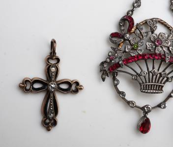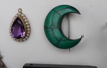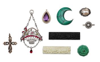 A collection of jewels including a diamond ring, late 19th/early 20th century, comprising: a diamond cluster ring, early 20th century, set with a cushion-shaped diamond within an outer ring of millegrain-bordered rose-cut diamonds, size Q1/2, numbered 1226; a gold cross pendant set with rose-cut diamonds; a pear-shaped amethyst and seed pearl pendant; a Baroque pearl ring in silver, size P, stamped 925; a malachite crescent moon brooch; a paste giardinetto pendant; and three Art Deco moulded glass beads designed as roses, one bead broken, pearls untested