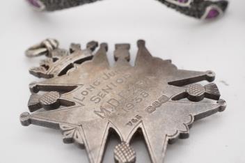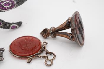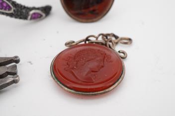 A collection of jewels including a snake bracelet, comprising: a hinged bangle modelled as a snake in silver, pavé-set with circular-cut black sapphires and synthetic rubies, its tongue a marquise-shaped synthetic ruby, its eyes set with synthetic sapphire cabochons, inner circumference approximately 17cm, stamped 925; together with a moulded glass intaglio after Pichler, Greek signature for Pichler, mounted in a gilt metal fob seal; a moulded glass cameo depicting a Bacchante; and a silver medal for Long Jump, dated 1938, length 4.6cm, British hallmarks