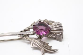 A collection of jewels including an Art Deco silver cigarette case, comprising: a Victorian gilt metal bracelet; a silver thistle brooch set with a violet paste; a silver pendant designed as a Pekinese dog; a Japoniste silver brooch designed as a cherry blossom flower between bound bamboo, British hallmarks, circa 1889; an Art Deco silver cigarette case applied with black lacquer, set with a synthetic sapphire clasp, British hallmarks, circa 1925; a shell cameo brooch with a polished black border; a gold floral stick pin set with a pink paste; and a silver dove pendant on a gilt metal chain necklace