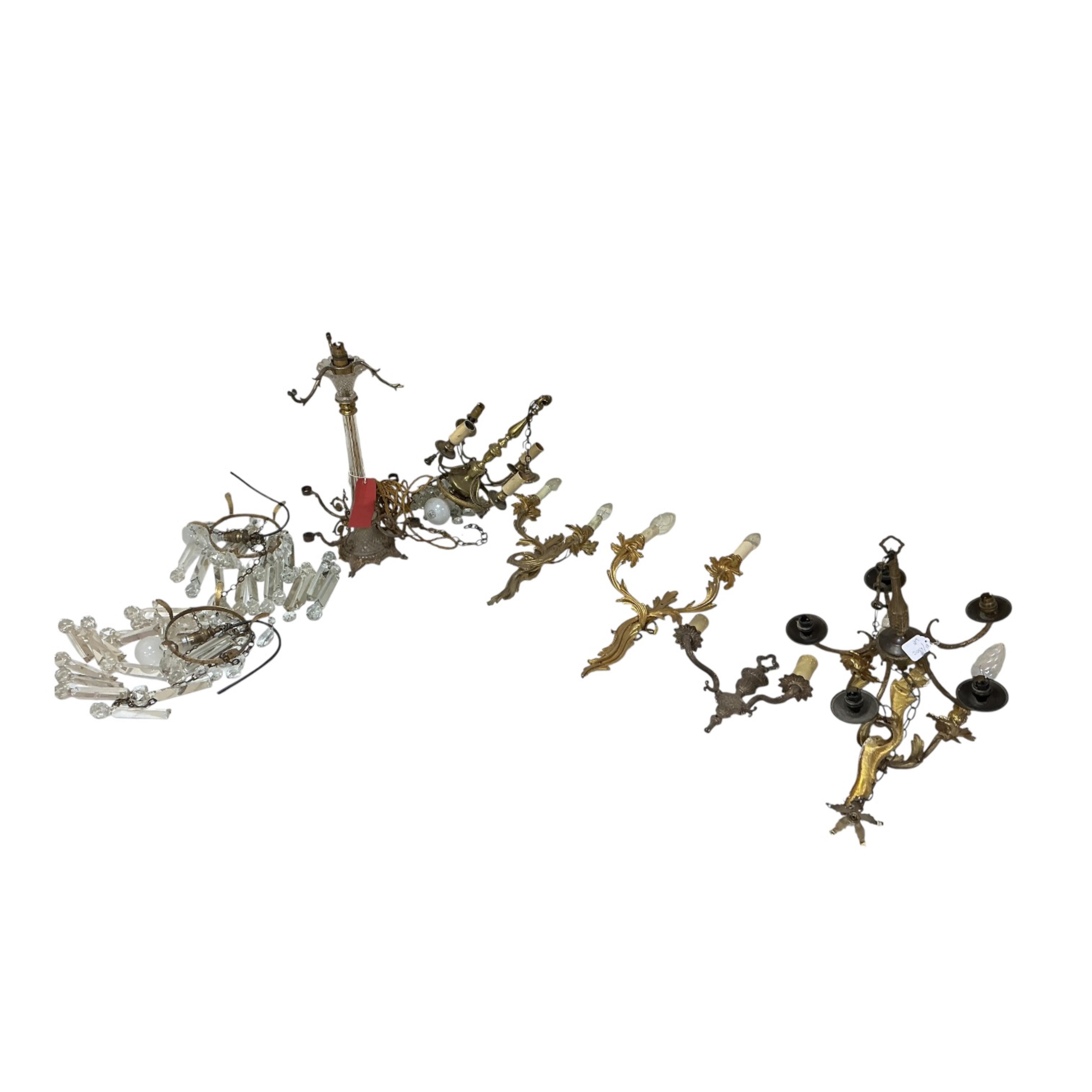 A collection of lighting to include a pair of ceiling hanging lustres, a five branch hanging light and gilt two branch wall lights