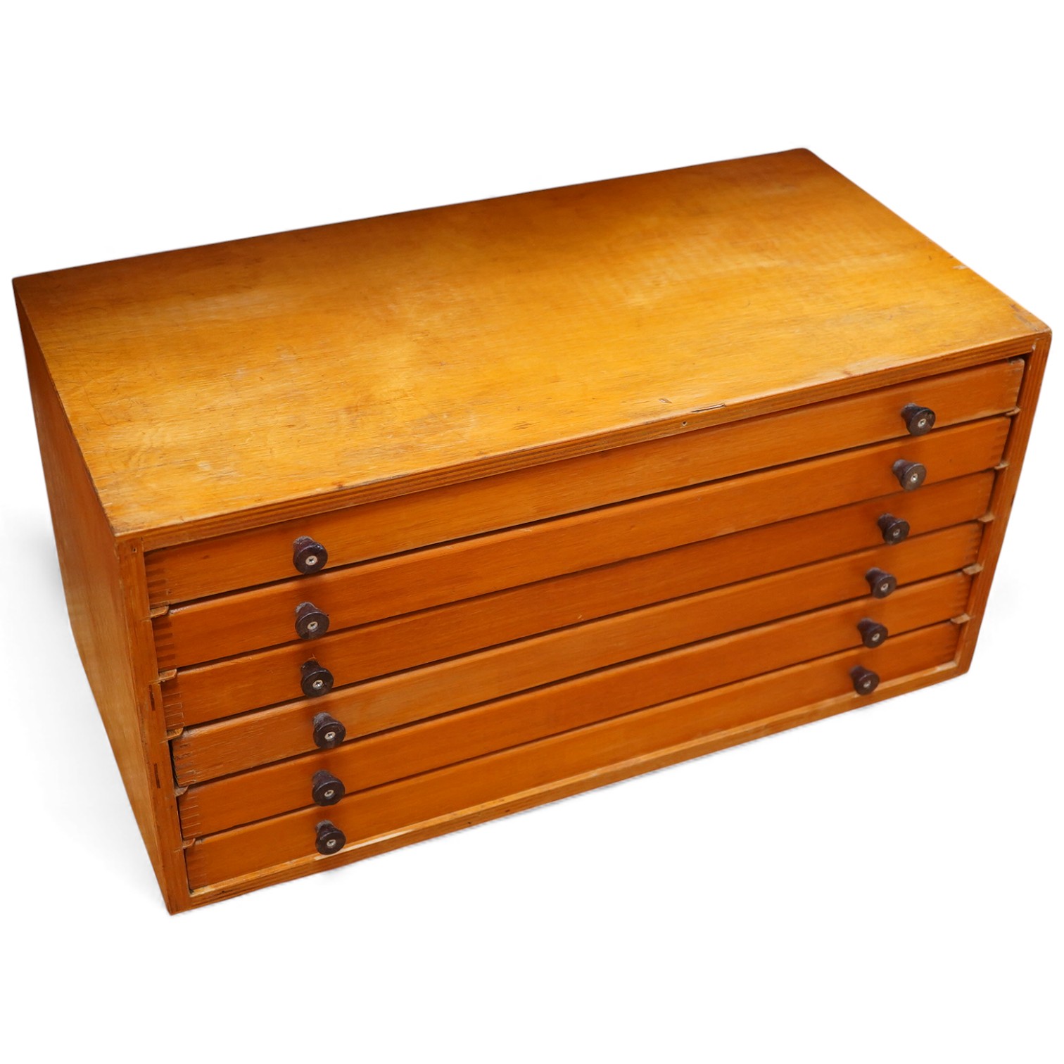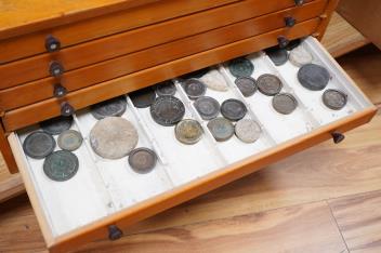 A collection of mainly Medieval to 19th century bronze and lead imperial circular trade weights, with a few Roman and later examples, stamped with Royal Cyphers, weights, the dagger assay mark for London, other proof marks, etc., together with some other weights of other forms, etc. contained within a plywood and pine six drawer collector’s cabinet