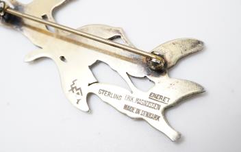 A collection of novelty jewels; comprising: a brooch designed as a boater hat inscribed 18 IHV 94; a silver and enamel brooch designed as a flight of swans draped in various European flags, length 6cm, signed Erik Magnussen Made in Denmark; a golfer, stamped 925; a brooch modelled as the head of a spaniel; and two silver cricket bat pendants, British hallmarks for 1930