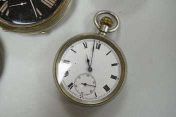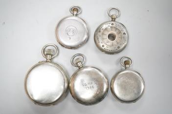 Lot 1927 , A collection of open faced pocket keyless watches to include a black faced Military pocket watch signed Carley & Clemence A1386, stamped verso GS MK. D 1386another black faced pocket watch, a silver open faced pocket wat