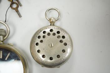 A collection of open faced pocket keyless watches to include a black faced Military pocket watch signed Carley & Clemence A1386, stamped verso GS MK. D 1386another black faced pocket watch, a silver open faced pocket watch and a Beck’s Damp Detector and Hygrometer.