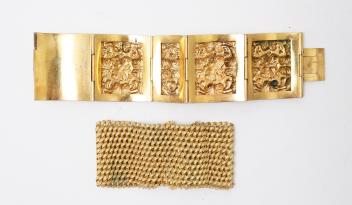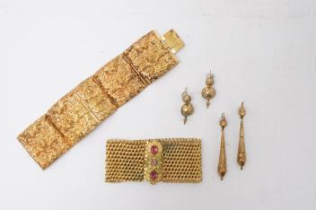 A collection of pinchbeck/gilt metal jewels, 19th century, comprising: a panel bracelet of embossed foliate design, length 17.5cm; a fancy mesh link bracelet, to a foliate clasp set with pink pastes, length 19.5cm; and two pairs of pendant earrings, longest pair 7cm, hook fittings