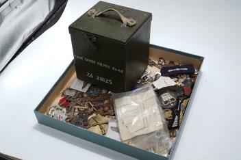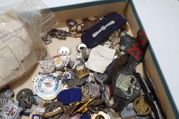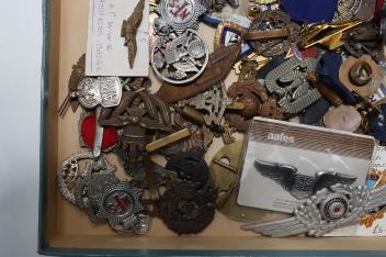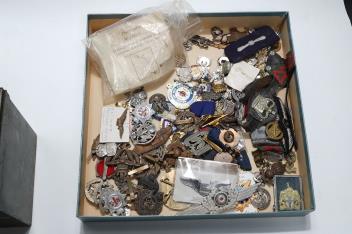 Lot 1316 , A collection of primarily 20th century military badges, lapel badges, shoulder titles, and other related ephemera, including seventeen military cap badges, cloth badges, ARP badges, etc., together with a military tin box