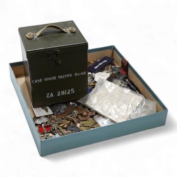 A collection of primarily 20th century military badges, lapel badges, shoulder titles, and other related ephemera, including seventeen military cap badges, cloth badges, ARP badges, etc., together with a military tin box for spare valves
