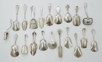 A collection of seventeen mainly 19th century Dutch white metal caddy spoons, to include two with shaped shovel bowls, date letter for 1868 and 1874, shaped bowl with centre groove, date letter for 1877, together with two other continental plated caddy spoons and a Dutch white metal sifter spoon, 12.1cm et infra.