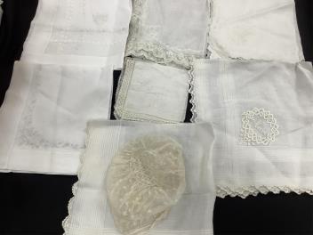 Lot 336 , A collection of seventeen mixed late 18th, 19th and early 20th century wedding hankies. Mostly with fine lawn centres, some lace trimmed, white worked or monogram embroidered, together with a needle run on net baby bonne