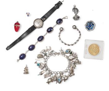 A collection of silver jewels, comprising: a single diamond stud earring weighing approximately 0.15 carats, accented with blue enamel; blue and colourless paste brooch of floral design, length 3.9cm; a dyed agate and faceted glass egg pendant; a silver wristwatch; a silver charm bracelet; a detached charm designed as a Helter Skelter; a sodalite cabochon bracelet; a silver torque bangle; and a gilt US 1964 half dollar