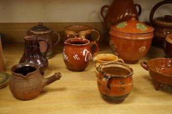 Lot 454 , A collection of sixteen 19th century and later Danish and Swedish kitchen pots, possibly “Lindkvist Kvidinge” mostly coloured slip decorated earthenware handled pots, tallest 29cm