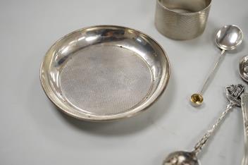 A collection of small silver including a small Edwardian sugar bowl, William Devenport, Birmingham, 1907, diameter 92mm(a.f.), a small shallow dish, a mounted glass bowl, a small quantity of silver and other white metal flatware and two plated items.