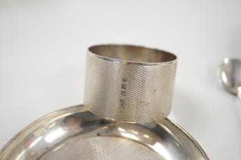 Lot 860 , A collection of small silver including a small Edwardian sugar bowl, William Devenport, Birmingham, 1907, diameter 92mm(a.f.), a small shallow dish, a mounted glass bowl, a small quantity of silver and other white metal