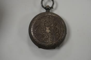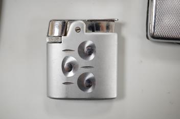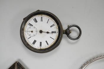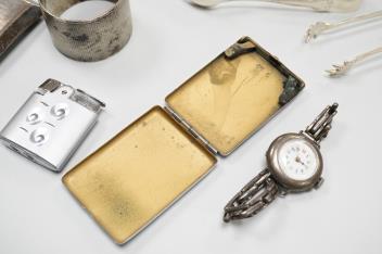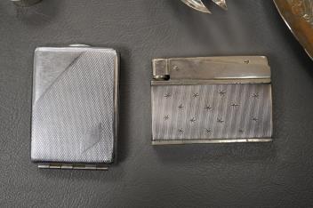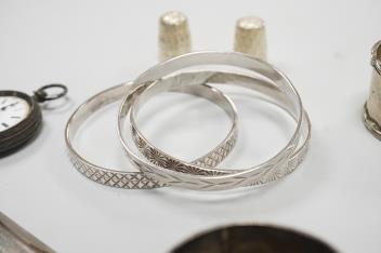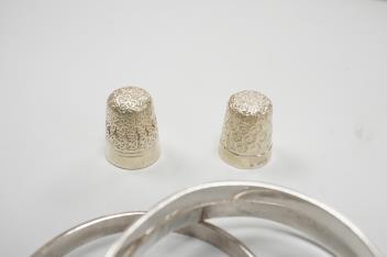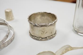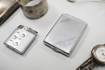 Lot 841 , A collection of small silver to include a cigarette case, two napkin rings, three pairs of sugar tongs, a thimble, a lady's wrist watch and a mounted glass toilet jar. together with a 925 fob watch, a 935 mounted lighter