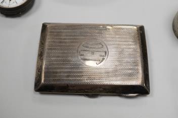A collection of small silver to include a cigarette case, two napkin rings, three pairs of sugar tongs, a thimble, a lady's wrist watch and a mounted glass toilet jar. together with a 925 fob watch, a 935 mounted lighter, pair of white metal salad servers and six base metal items.