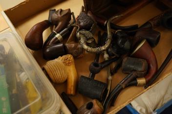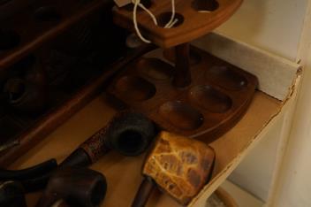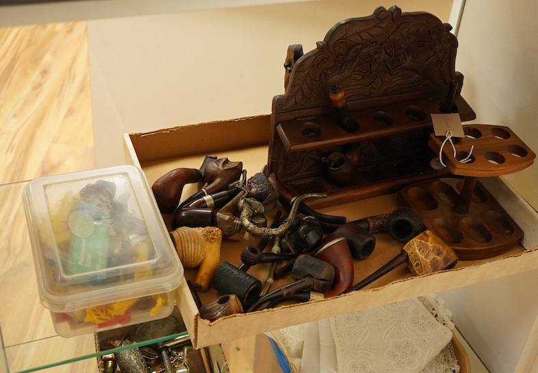 A collection of smoker's novelty pipes and three pipe racks