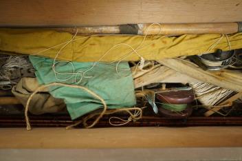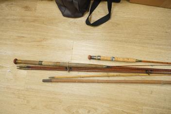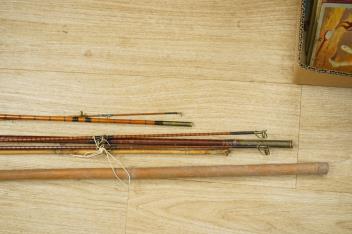 A collection of split cane fishing rods, reels, landing net etc contained in a large wooden box
