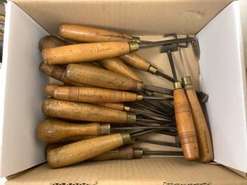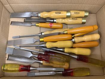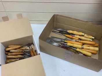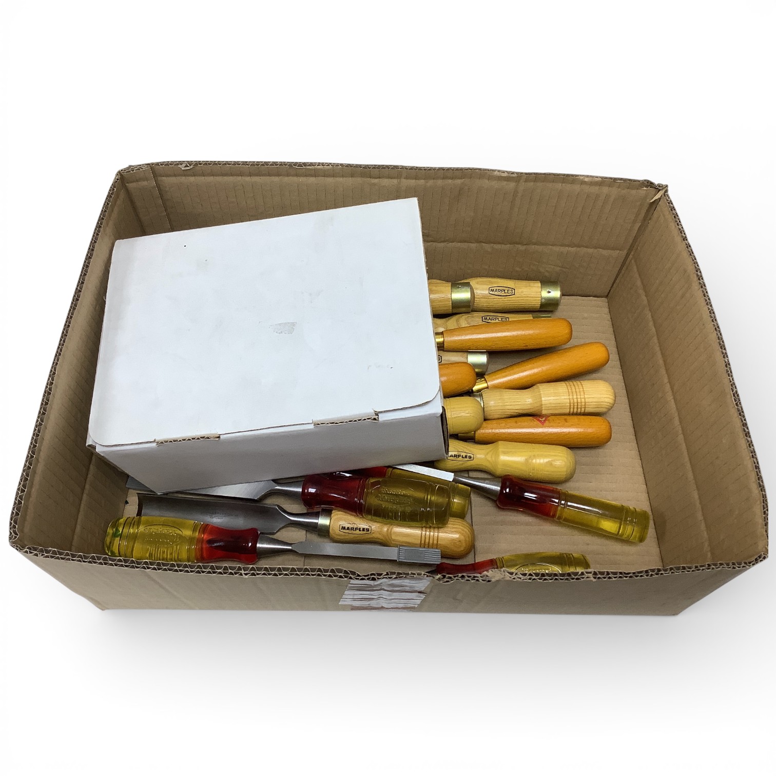 Lot 1077 , A collection of thirty-eight chisels including modern Marples chisels, carving chisels, Record Marples examples, together with older drawer lock chisels, gouges, etc.