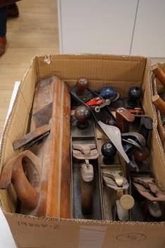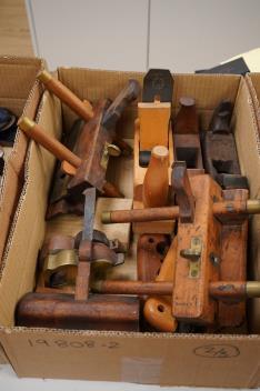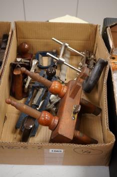 Lot 1065 , A collection of twenty woodworking planes, including an unmarked gunmetal chariot plane, together with another similar steel chariot plane, a Stanley No.050 combination plane, a beechwood skew rabbet jointer, a Stanley B