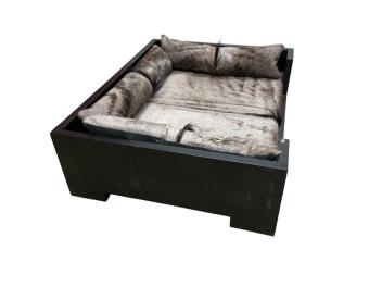 A contemporary ebonised dogs bed with faux fur cushions, width 97cm, depth 77cm, height 29cm