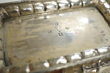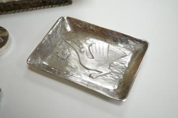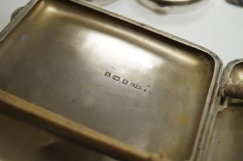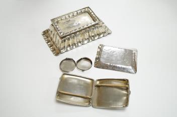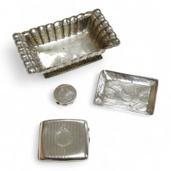 Lot 1861 , A continental 800 standard oblong shaped dish, of fluted design, together with a Peruvian sterling dish and similar pill box and a George V silver cigarette case, 16.6oz.