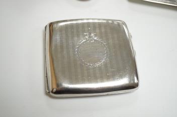 A continental 800 standard oblong shaped dish, of fluted design, together with a Peruvian sterling dish and similar pill box and a George V silver cigarette case, 16.6oz.
