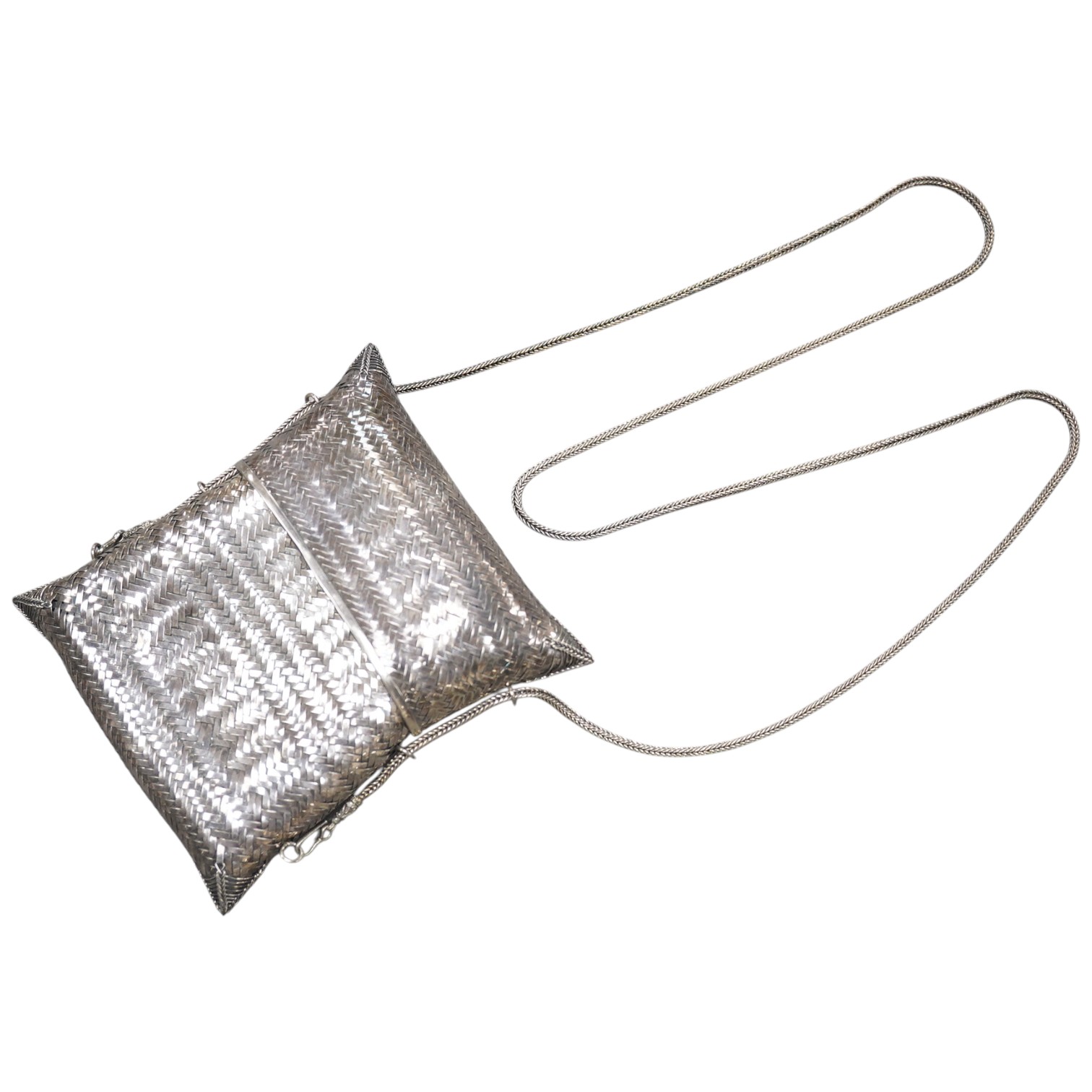 Lot 837 , A continental white metal (stamped Silver 925) evening purse, of interwoven chevron design, with a white metal shoulder strap, 7.3oz.