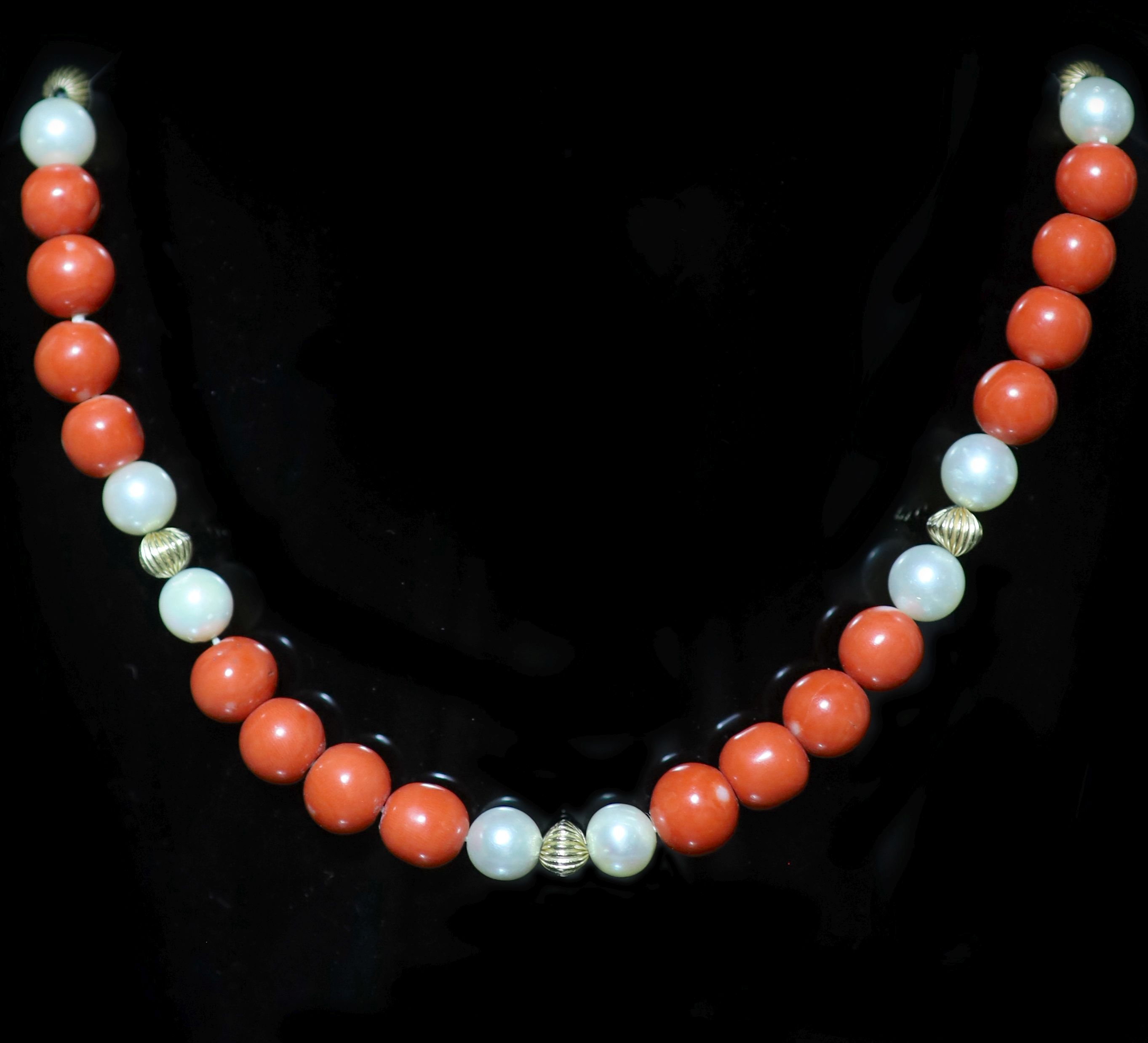 Lot 705 , A coral bead and cultured pearl necklace with 14K yellow gold clasp,
