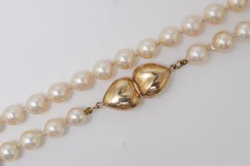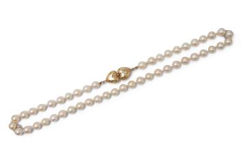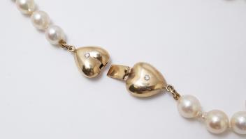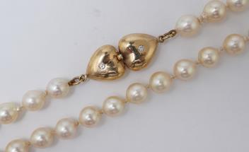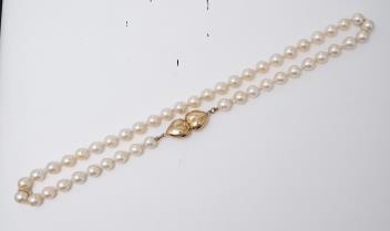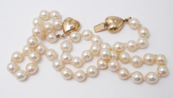 A cultured pearl, gold and diamond necklace, designed as a single strand of cultured pearls measuring approximately 8mm, to a gold clasp designed as a pair of confronted hearts, set with brilliant-cut diamonds totalling approximately 0.10 carats, length 48cm
