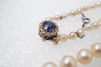Early clasp on a later strand of cultured pearls. Sapphire very attractive, fissure within stone, surface-reaching, but not obvious to naked eye - appearing a lovely well-saturated colour with good clarity and a lively cut. Diamonds bright and lively, pearls in good condition. Sapphire approx. 6.5mm. Pearls approx. 3.9mm to 9.2mm.