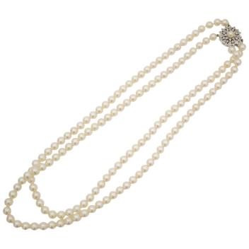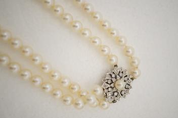 Lot 1138 , A cultured pearl and diamond necklace, mid 20th century, composed of two rows of cultured pearls measuring approximately 7-7.5mm diameter, to a foliate clasp set with single-cut diamonds totalling approximately 0.60 cara