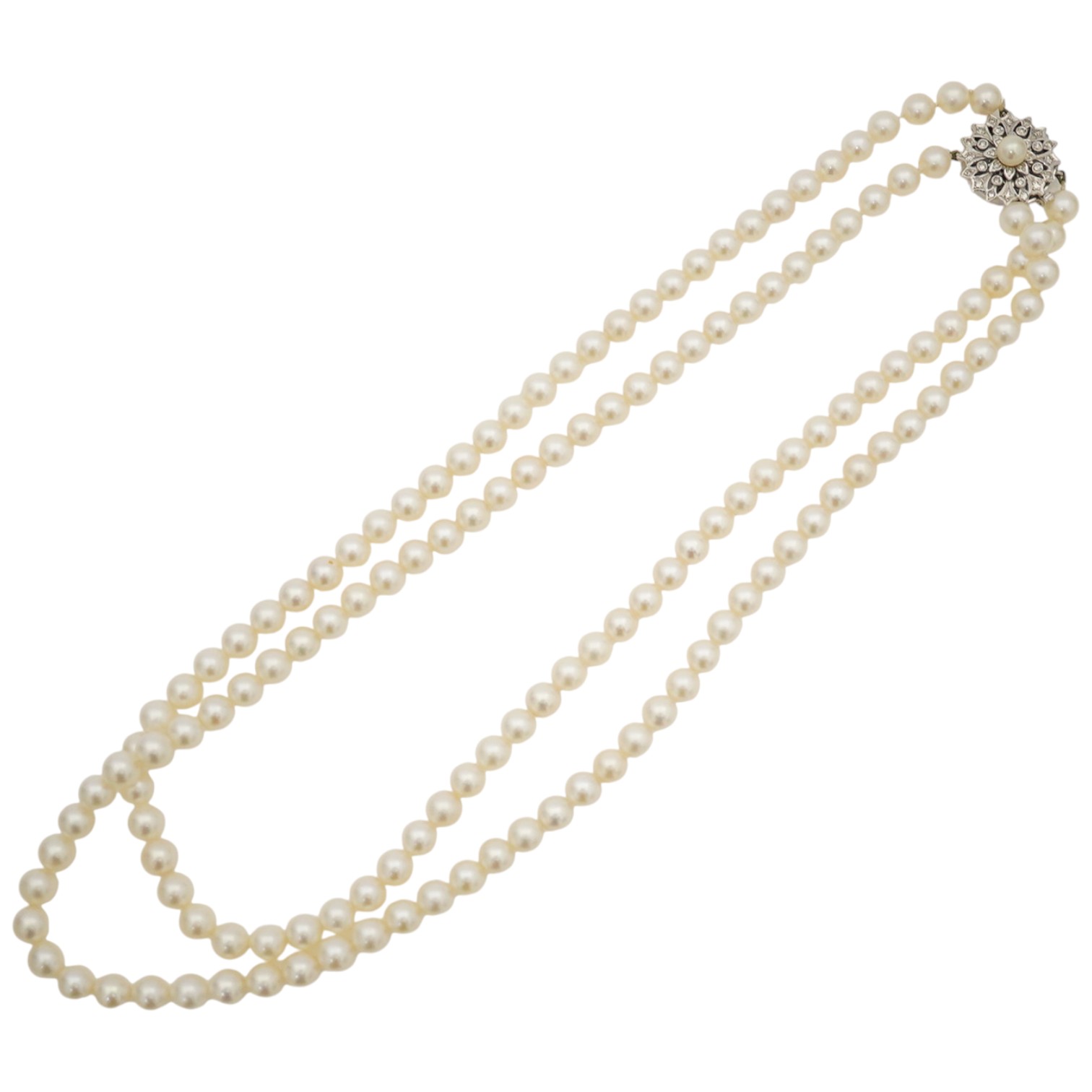 A cultured pearl and diamond necklace, mid 20th century, composed of two rows of cultured pearls measuring approximately 7-7.5mm diameter, to a foliate clasp set with single-cut diamonds totalling approximately 0.60 carats, length 52cm, gross weight approximately 85 grams
