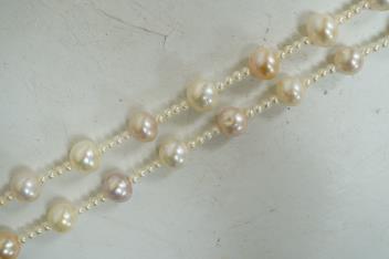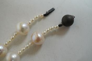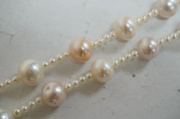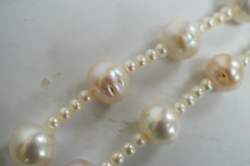 Lot 1946 , A cultured pearl necklace, composed of cultured pearls of subtly varied tints measuring approximately 12mm diameter on average, spaced by sections of smaller cultured pearls, to a blackened silver clasp, length approxima