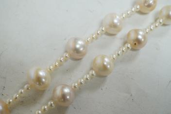 A cultured pearl necklace, composed of cultured pearls of subtly varied tints measuring approximately 12mm diameter on average, spaced by sections of smaller cultured pearls, to a blackened silver clasp, length approxima