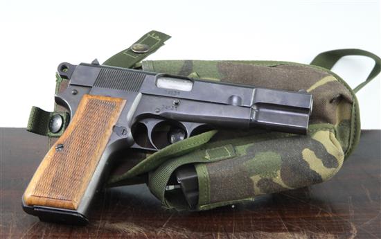 A de-activated Browning mark II high power 9mm automatic pistol, serial no. 74631, together with a certificate of de-activation dated 2008 and Defence Council User Handbook, camouflage holster and spare magazine