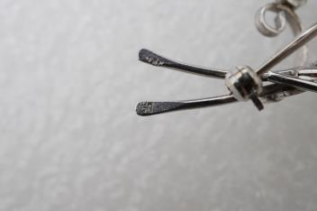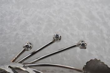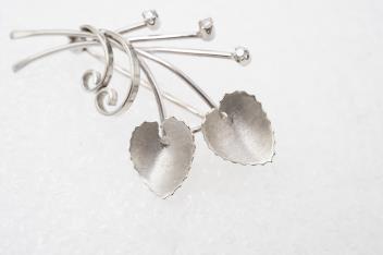 Lot 923 , A diamond brooch, designed as stylised foliate spray in white gold, accented with three brilliant-cut diamonds totalling approximately 0.15 carats, length 5.2cm, stamped 750, gross weight 5 grams.