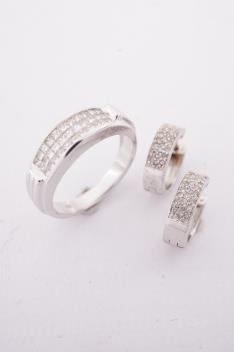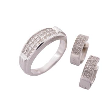 A diamond demi-parure, comprising: a ring, channel-set to the front with three rows of princess-cut diamonds totalling approximately 0.60 carats, mounted in 18ct white gold, size N1/2, British hallmarks, gross weight approximately 6 grams; and a pair of diamond sleeper hoops in 9ct gold, length 1.2cm each, British hallmarks, combined gross weight approximately 3 grams