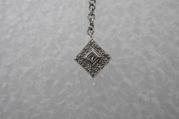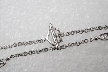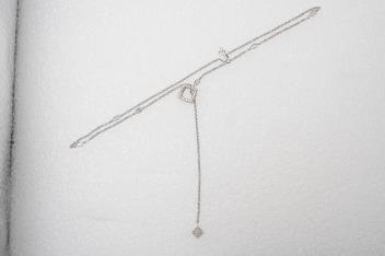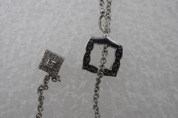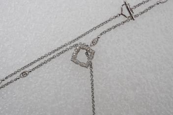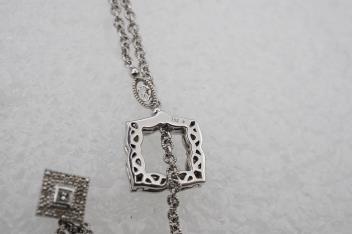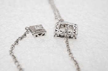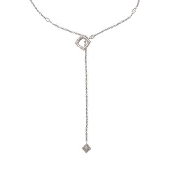 A diamond lariat necklace, the long chain composed of twisted wire links punctuated by oval links enclosing the letters 'CX', passing through a foliate square link set with brilliant-cut diamond, suspending a square pendant set with a princess-cut diamond within a border of brilliant-cut diamond, to a T-bar clasp, in white gold, length adjustable, max length 47cm, stamped 750, gross weight approximately 10 grams
