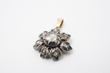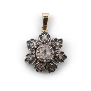 A diamond pendant, of floral design, set with foil-backed rose-cut diamonds, mounted in silver and gold, length 3cm including bail, one diamond deficient