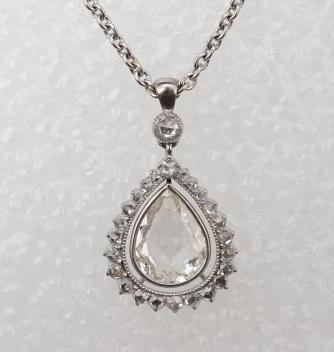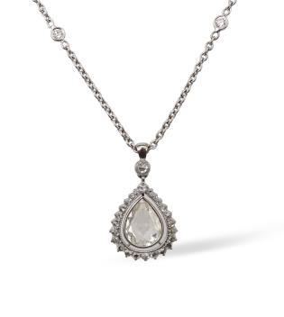 A diamond pendant, set with a shallow pear-shaped diamond measuring approximately 10.5 x 8.0 x 2.2mm, suspended within a frame of rose-cut diamonds, to a chain spectacle-set with brilliant-cut diamonds, pendant length 2.6cm, chain length 40cm