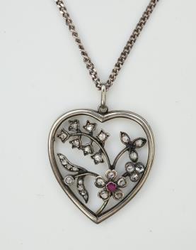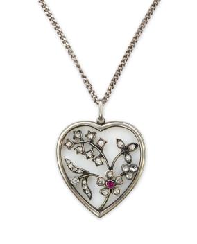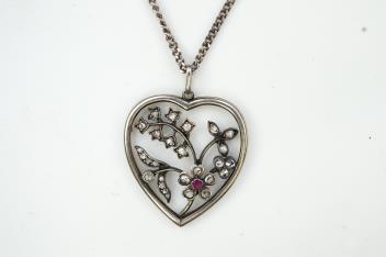 Lot 2965 , A diamond pendant, designed as a spray of flowers in a heart-shaped frame, set with rose-cut diamonds and a circular-cut ruby, to a later silver chain, pendant 3.1cm, chain length 44cm
