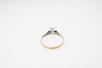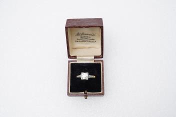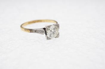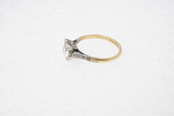 A diamond ring, set with a brilliant-cut diamond weighing approximately 0.85 carats, in a square setting, to single cut diamond shoulders, mounted in gold and platinum, size Q, stamped 18CT PLAT